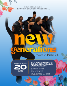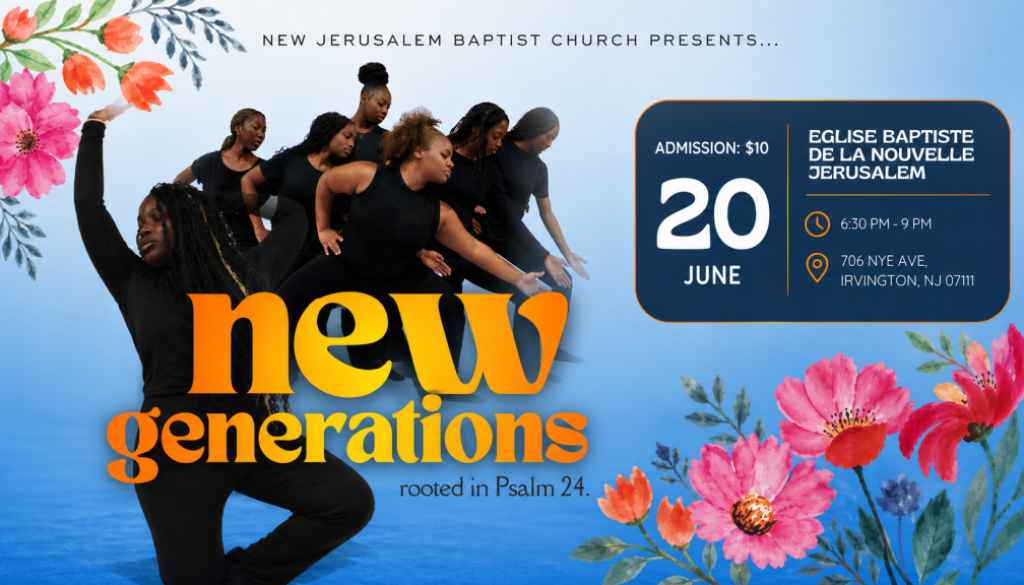 Calendar Add to Calendar Add to Timely Calendar Add to Google Add to Outlook Add to Apple Calendar Add to other calendar Export to XML When: June 20, 2026 @ 6:30 pm – 9:00 pm 2026-06-20T18:30:00-04:00 2026-06-20T21:00:00-04:00 Where: New Jerusalem Baptist Church 706 Nye Avenue Irvington NJ 07111 Cost: $10 per person Contact: Wilmine Vincent (908) 265-1344 Dance Concert Dance Team Concert - Save the Date