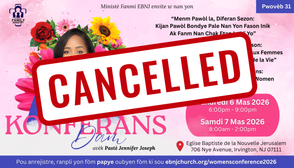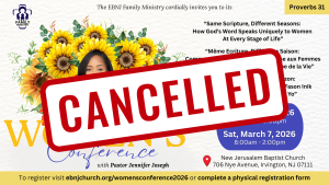 Thank you to everyone who registered or planned to join us. Unfortunately, we must announce the cancellation of the 2026 EBNJ Women’s Conference, which was set for March 6th and 7th, due to the recent loss of our beloved church members. We sincerely apologize for any inconvenience this may cause and look forward to seeing you at next year’s event.