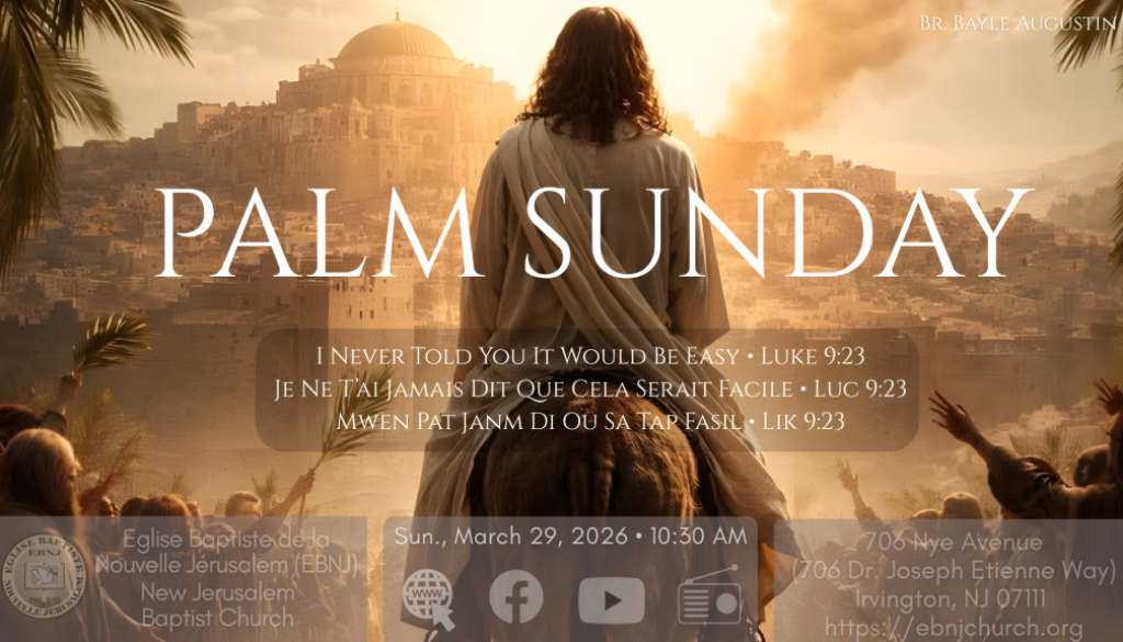 Calendar Add to Calendar Add to Timely Calendar Add to Google Add to Outlook Add to Apple Calendar Add to other calendar Export to XML When: March 29, 2026 @ 10:30 am – 12:15 pm 2026-03-29T10:30:00-04:00 2026-03-29T12:15:00-04:00 Where: Eglise Baptiste de la Nouvelle Jerusalem 706 Nye Avenue Irvington NJ 07111 Contact: Eglise Baptiste de la Nouvelle Jerusalem (973) 372-8782